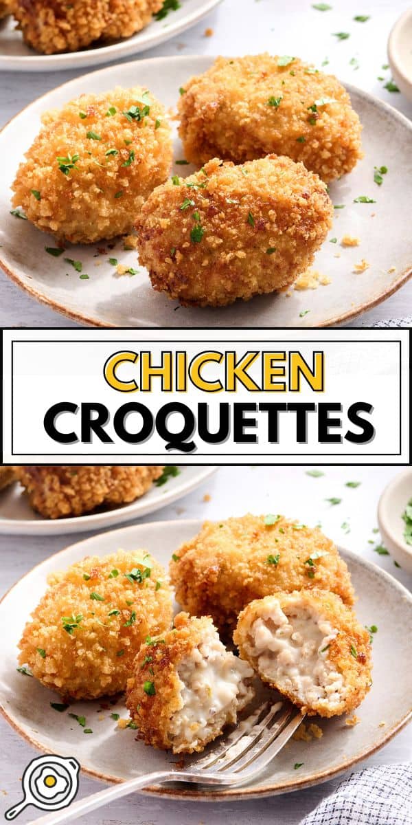 Have you ever heard of Chicken Croquettes? If you haven’t, don’t worry. They’re similar to chicken nuggets, but fancier. They’re made with pantry staples I already had on hand, and a little bit of patience. Well-seasoned chicken is combined with a creamy sauce, then breaded and fried to golden perfection. If you’ve tried to make chicken croquettes before and they turned into an oozy mess, here is where patience comes in. Make sure to chill the mixture, shape, and freeze them until they’re firm, before breading and frying. This simple make-ahead step keeps them from falling apart and guarantees a crunchy outside every time!