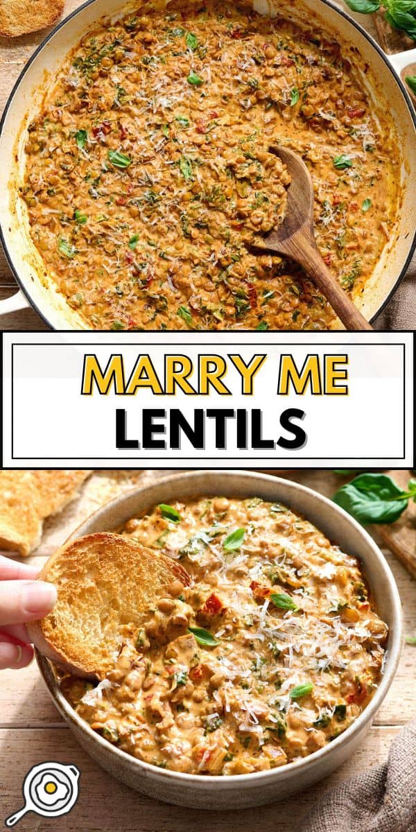 Like Marry Me chicken, this lentil recipe is all about that creamy, savory, slightly tangy flavor combo that’s hard not to love. I start by sautéing onion, garlic, sun-dried tomatoes, and tomato paste to build a deep flavor base, then let the lentils simmer in broth with Italian seasoning until tender. Heavy cream and Parmesan get stirred in at the end to make everything extra luscious, and I love adding a handful of frozen spinach to really level up the dish. These Marry Me lentils are a pantry meal made a little fancy, and are SO good spooned into a bowl with some crusty bread.
