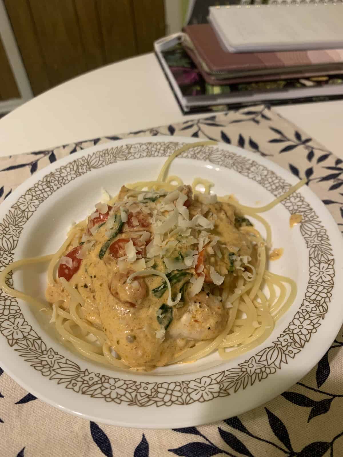 I made this delicious recipe for our Valentines family dinner tonight. It was so good. I added some small pieces of broccoli and served it over fine pasta.