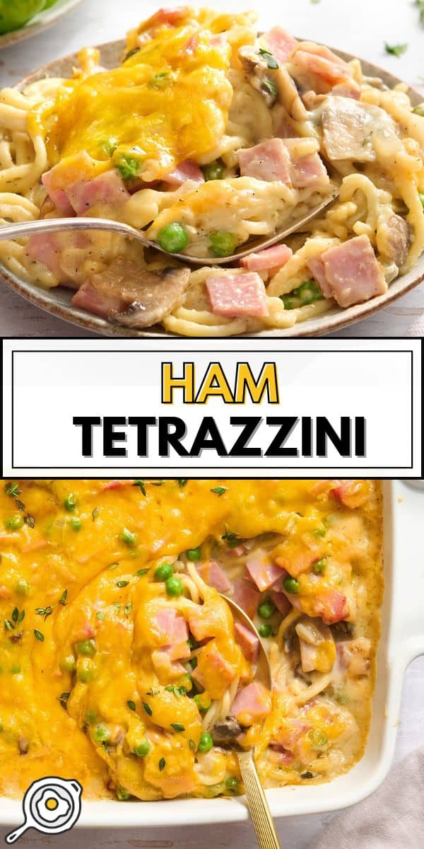 Ham tetrazzini is a classic baked spaghetti casserole made with tender spaghetti, diced ham, and a velvety sauce that bakes up bubbly and rich. Instead of using canned cream soups to make the sauce like my Mom did back in the day, I whisk together a simple homemade sauce, starting with a butter and flour mix to make a roux. I still add mushrooms and peas, a traditional part of this Italian American dish (depending on who you ask!). Then I finish it off with a generous layer of melty cheddar cheese, because that’s exactly how Mom always did it, and I wouldn’t dream of skipping it.