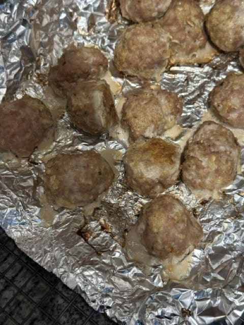 Shape into balls: Divide and shape the meatball mixture into about 32 balls, 2 Tbsp each. I have small hands, so this may actually look bigger than they were. I used a 2 Tbsp measuring cup to portion the meat.