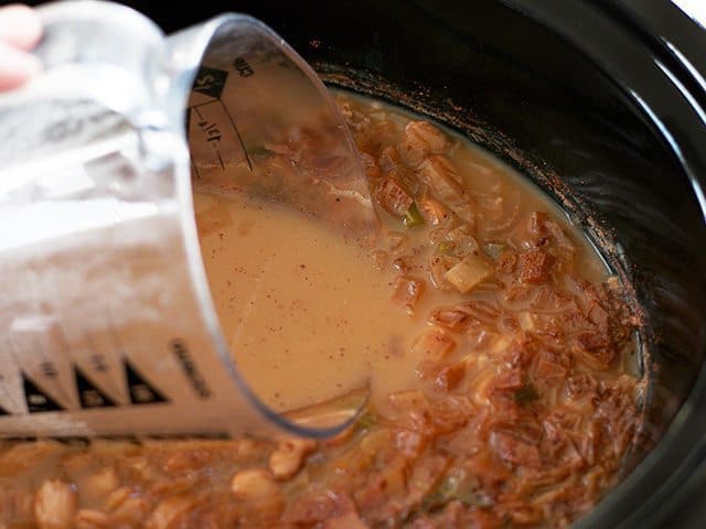 - Add the sorted and rinsed beans to the slow cooker along with 6 cups of water. Stir everything to distribute the seasoning. Secure the lid and cook on high for 4-5 hours or on low for 8. It’s okay if they cook longer, they’ll just be easier to mash.