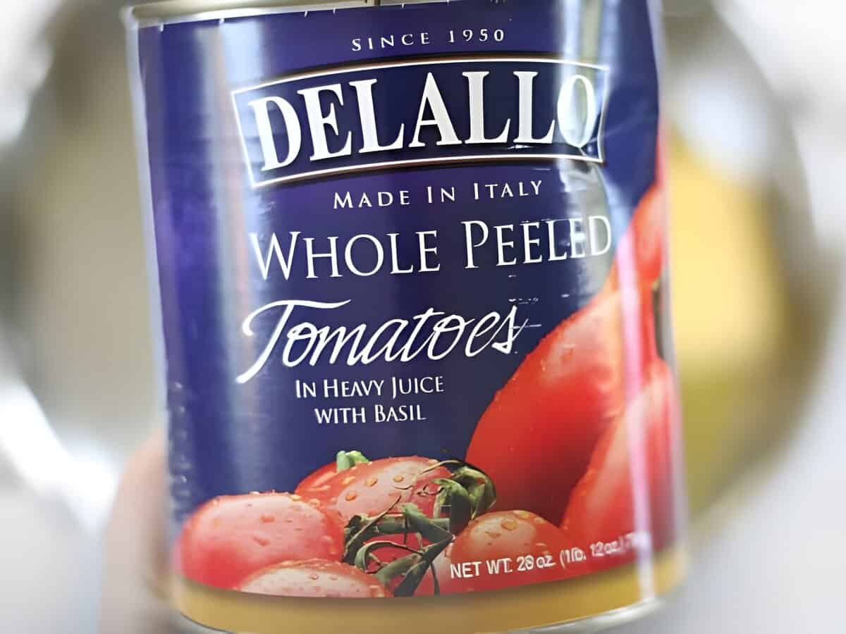 Then add one 28 oz. can of whole peeled tomatoes to the skillet.