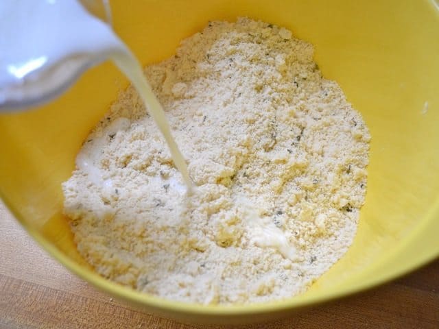 Add the dry ingredients to the bowl: flour baking powder, salt, sugar, and dried parsley. Stir until they are well combined.
