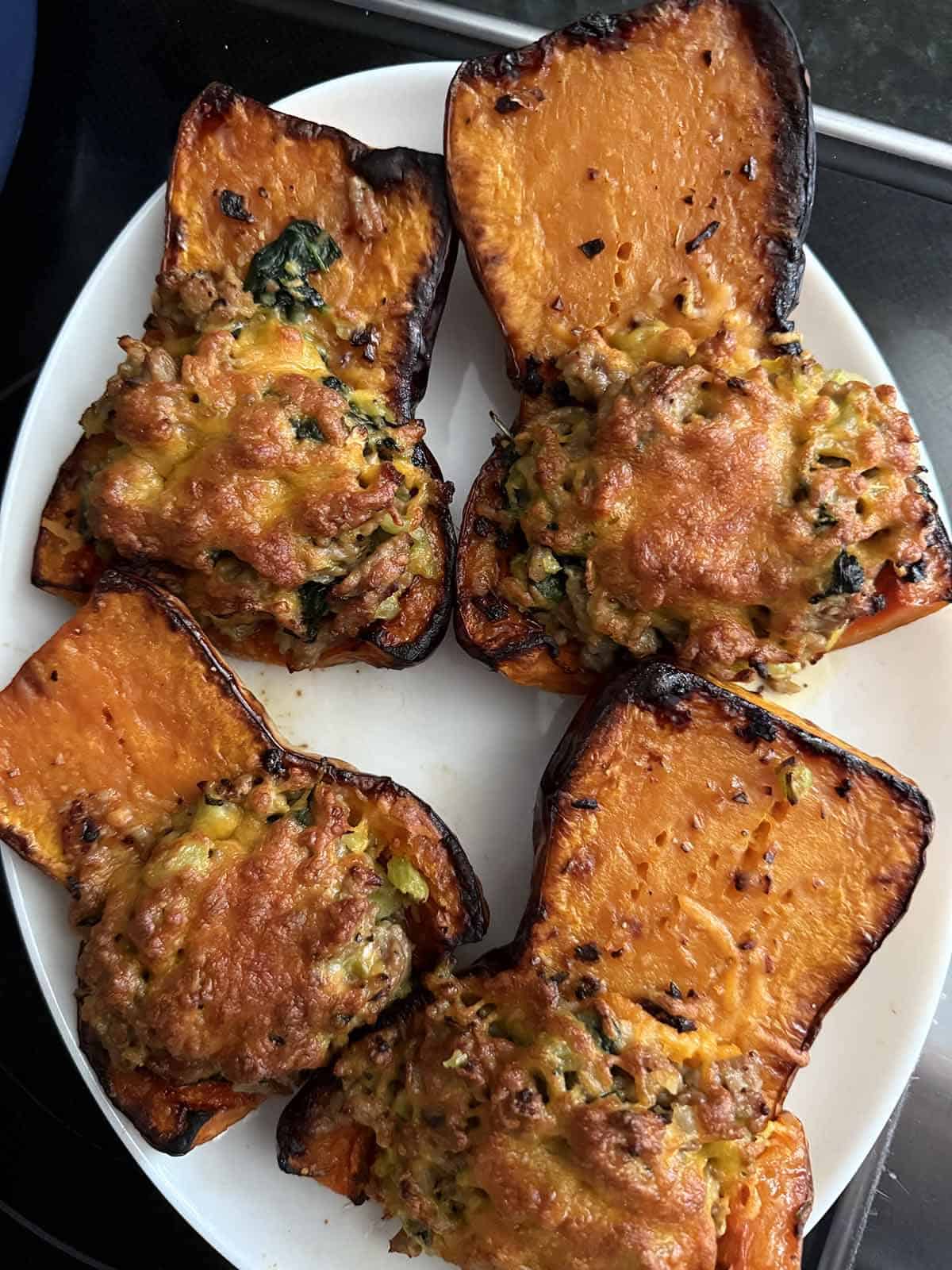 - Don’t be afraid to overstuff your butternut squash! It’s meant to be a hearty, filling meal or side dish. I love how the filling mounds on top, and the cheese gets golden and crispy. You’ll divvy up the filling and cut the squash to portion it out to serve.