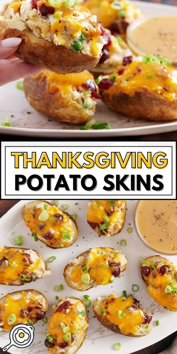 - Top your Thanksgiving leftover potato skins served hot, topped with sliced green onions and with gravy on the side for dipping!